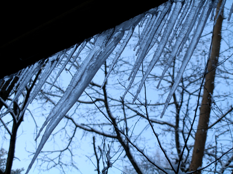 ・屋根の雪は昼間の日光で解けてぽたぽたと落ちてくる。それが氷柱になってぶら下がる。大きいほど見事で美しいが、あまり大きくならないうちにはたいて落とすことにしている。薪を取りにいったり雪かきをしたりして真下を歩くから、頭に落ちてきたらかなわない。氷柱は鋭い武器になって、しかも証拠が残らない。「氷柱殺人事件」なんてのはなかったかな、などと、またまたここでも想像たくましくしてしまった。そういえば、雪が降る前には朽ちた倒木にスギヒラタケを見つけた。食用だが、今年は猛暑のせいか毒性が強くて、当たって死んだ人が続出した。「スギヒラタケ殺人事件」………。