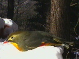 ・右の野鳥は「相思鳥」という。篭抜け鳥が野生化したもので、中国南部が原産だそうだ。つがいで行動する相思相愛の鳥というのが名前の所以らしい。だとすると、この死んだ鳥の相手はどうしたのだろうか。最愛のパートナーを失って寒い冬を越さなければならない。篭の中で飼われていた頃からのつがいで、一緒に逃避行をしたのか、あるいは逃げた後で出逢ったのか。死んだ鳥を写真に撮りながら、そんなことをあれこれ考えてしまった。それにしても派手な色で、腹は黄色のグラデーションで羽根にかけて鮮やかな赤になる。しかしやっぱり、このあたりには似合わない。「野鳥激突死事件」………。