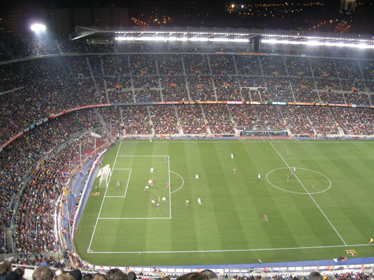 ・バルセロナでサッカーを見た。FCバルセロナは今、スペイン・リーグの首位にいる。スター軍団のレアル・マドリードほどではないが、ロナウジーニョやエトーなど、日本でもなじみの選手が多い。とてもチケットは取れないと思っていたが、ここに住んでいる友人が取ってくれた。一番安い席でも30ユーロ(4200円ぐらい)したが、客席はほぼ満員だった。その最後列に近い席からフィールドを見下ろすように見た。収容人員は98000人、スタジアムの大きさがよくわかった。試合開始は何と夜の10時、毎日の強行日程でいつもなら寝ている時間だが、今日ばかりはそういうわけにはいかなかった。